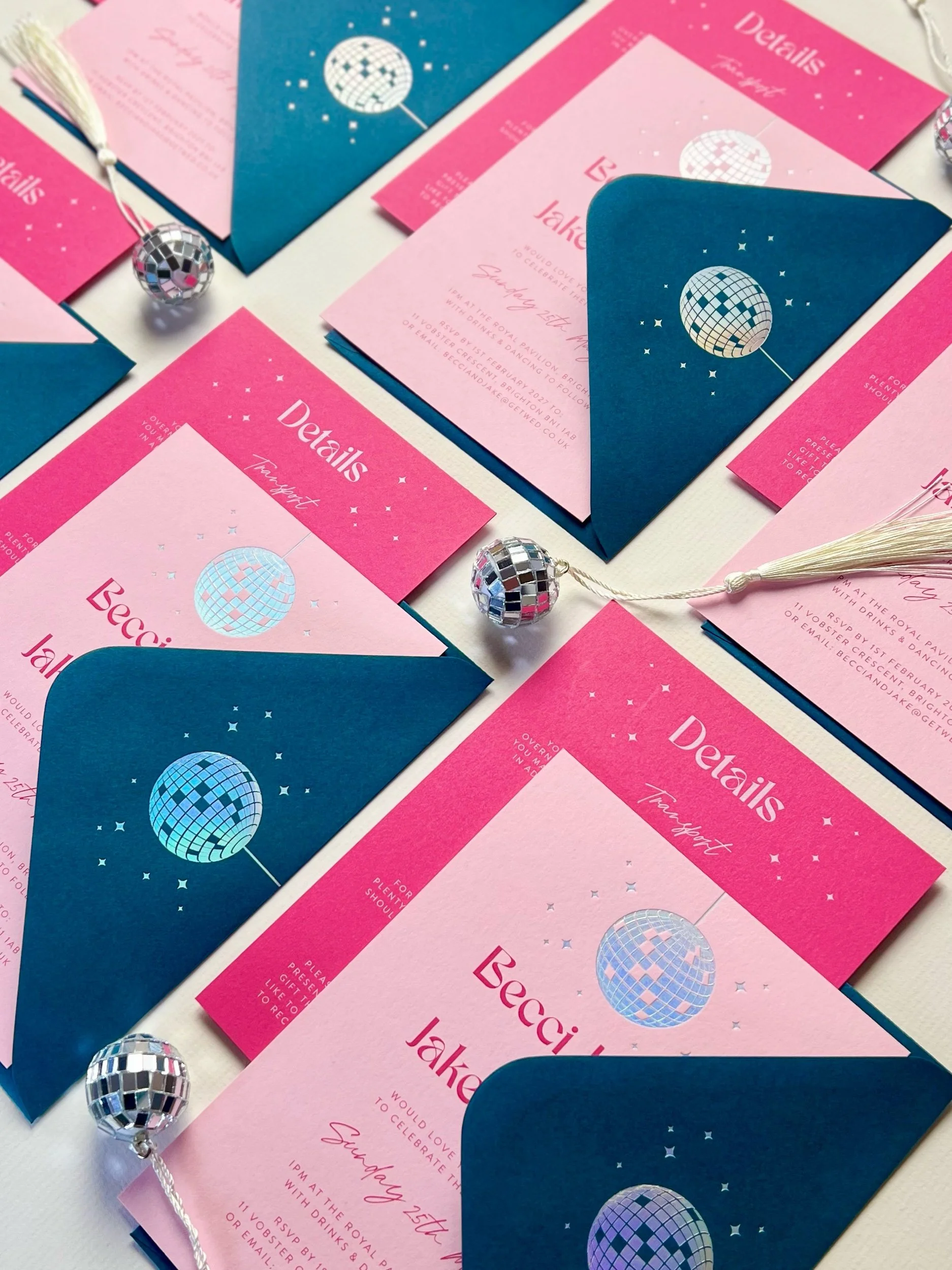 A relaxed, party vibe collection shown here in soft ice cream colours with complimentary bright teal and hot pink and iridescent rainbow and satin gold foils. (Available with rounded or straight corners.)