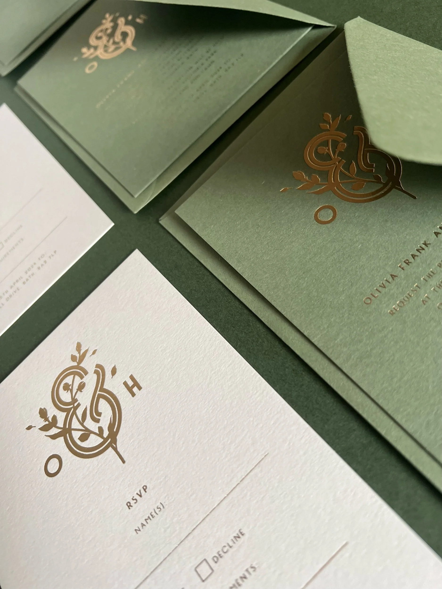 This wedding stationery suite incorporates a typographic inline ampersand, entwined in foliage with your initials either side. Individually foil blocked in house the traditional way, by hand. If you would like to see a visual set up in your colours, please get in touch. This design can be foiled or digitally printed.