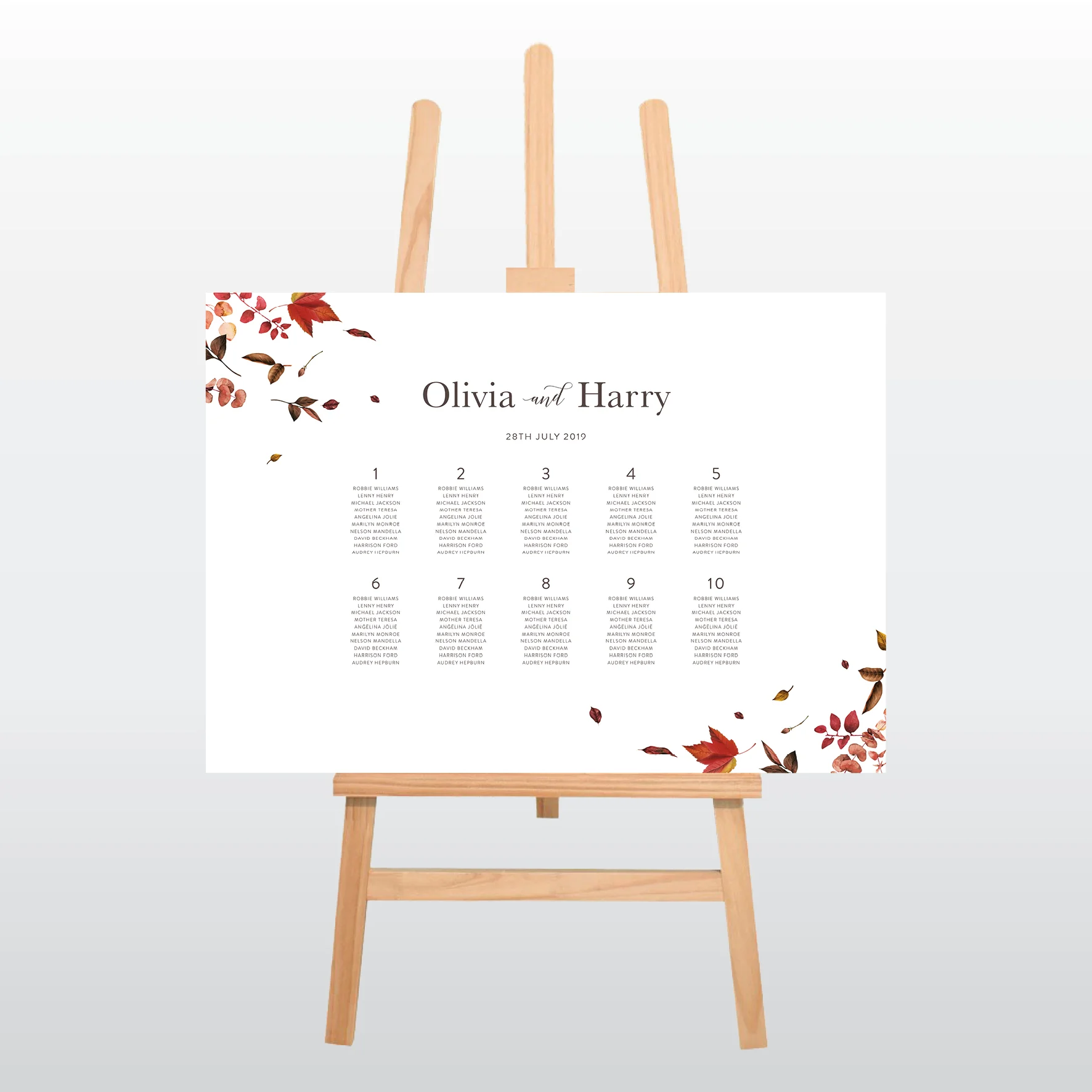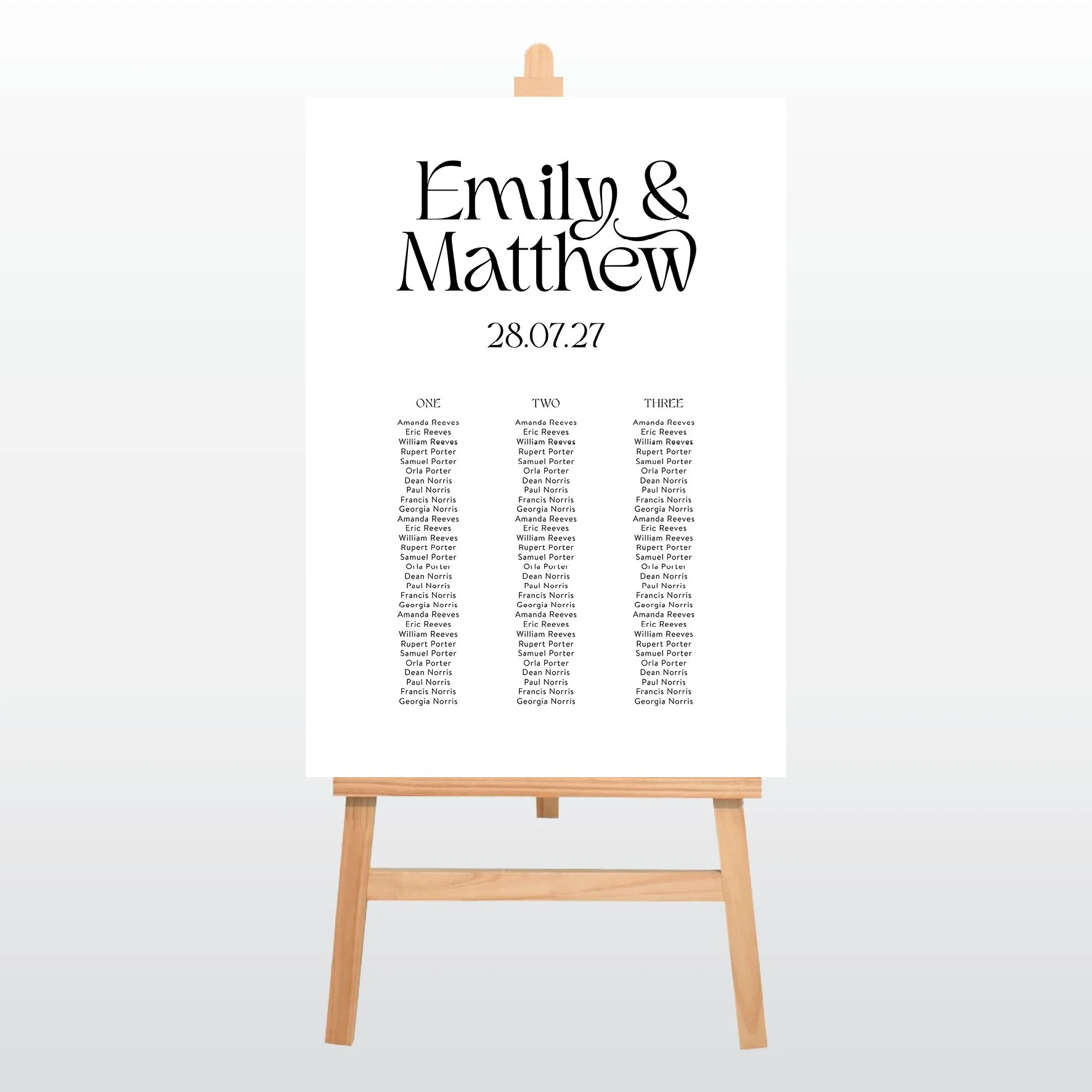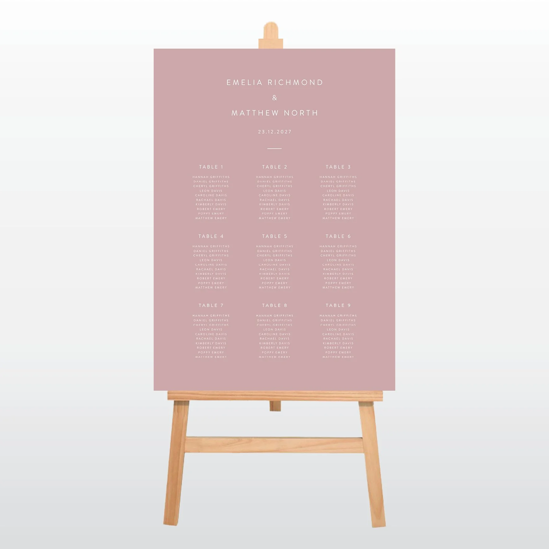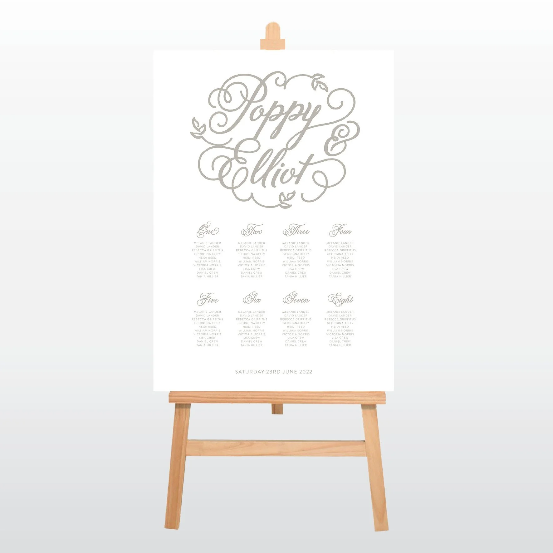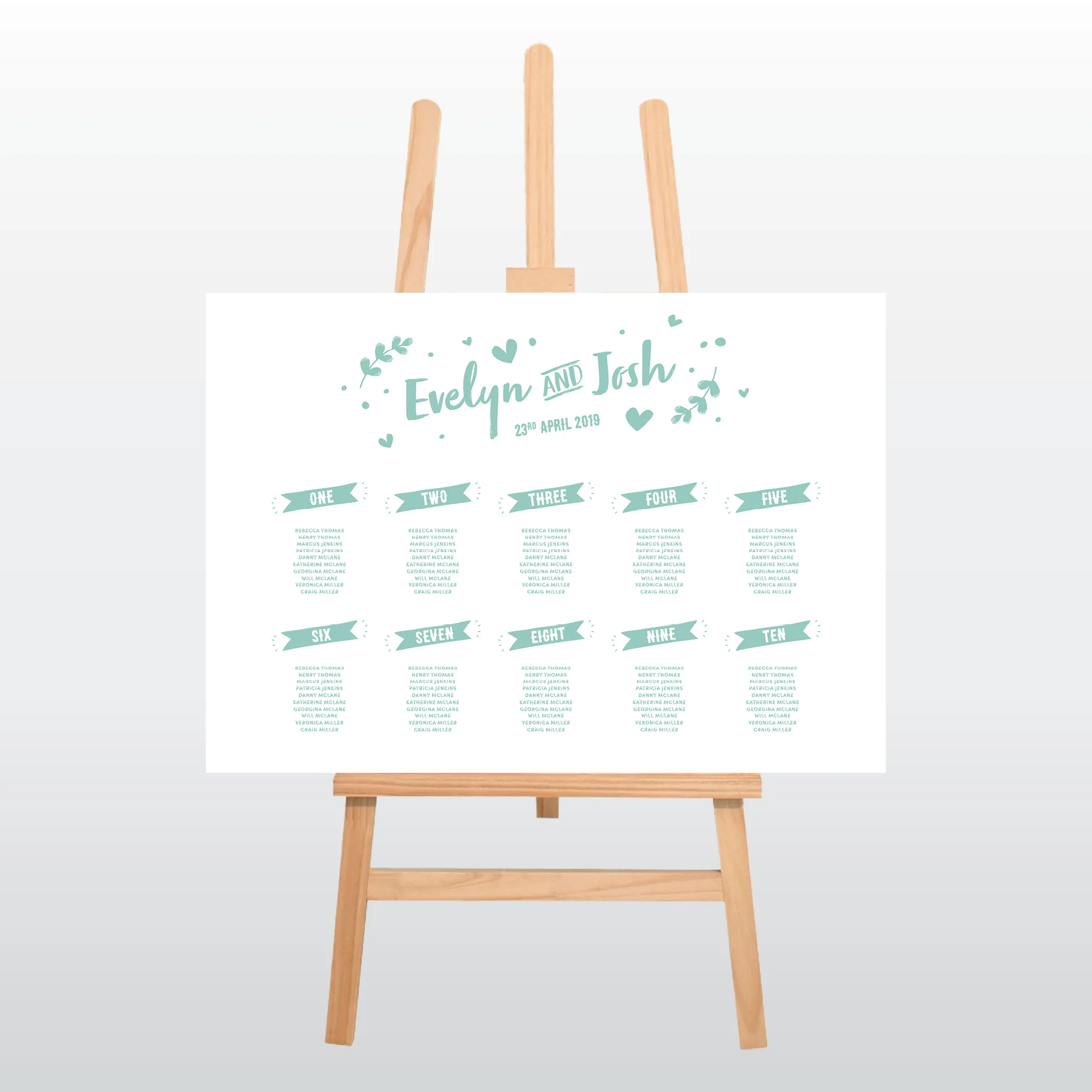 We have an extensive collection of beautifully designed, fully customisable wedding table plans, welcome signs and venue signage to not only wow your guests but help guide them on the day. We have styles, colours, fonts and shapes to suit all occasions, from formal sit-down wedding breakfasts to more relaxed and casual, buffet-style receptions, our table plan collection accommodates weddings of all sizes and styles. Choose a seating plan design that not only reflects the style and theme of your wedding but provides a clear indication of where your guests will be seated. The majority of our table plans and signs can be printed landscape or portrait in orientation, with straight or shaped options, such as arched or wavy and in A0, A1 or A2 sizes, printed digitally on rigid foamex board. Contact us if you have any questions about our wedding table plans.